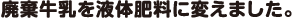 もともと牛乳は血液からできているので、色々なミネラルや、植物が育つ上で不可欠なチッ素・リン・カリウムなどの栄養素も含んでおります。ミルクパワーの製法は、わが社が汚水処理事業で開発した『大地』のプラントと同じような過程で行います。牛乳を曝気して微生物の力で発酵をさせ分離させる…「本当に元が牛乳だったの!?」と疑いたくなるほど透明な液体肥料に変わります。